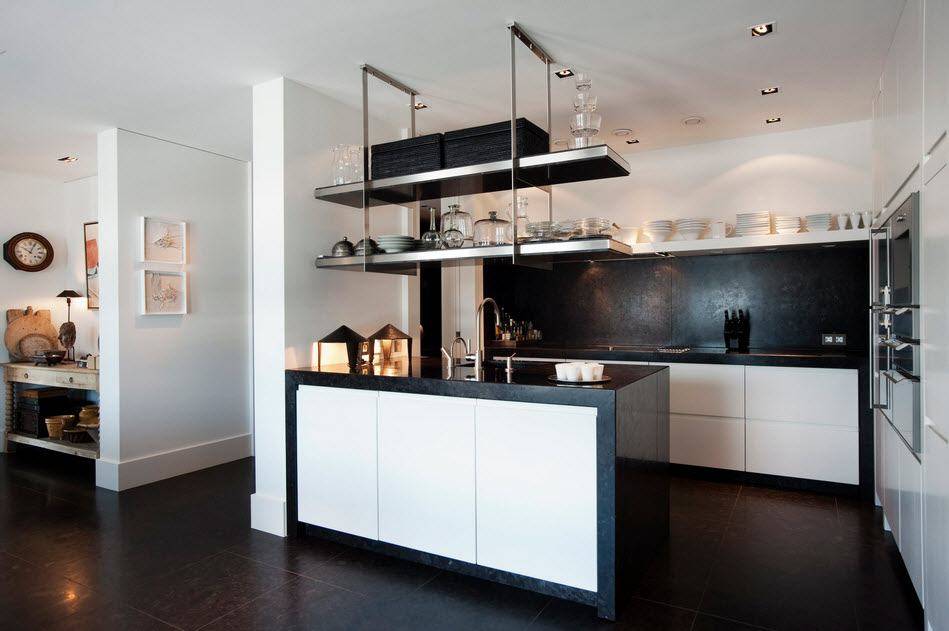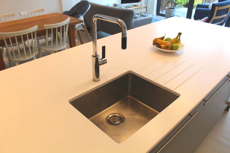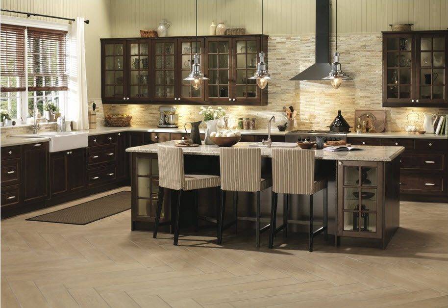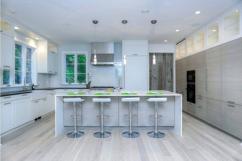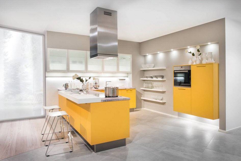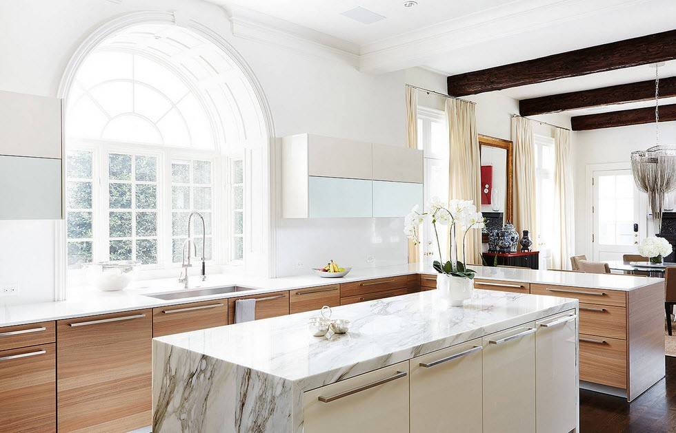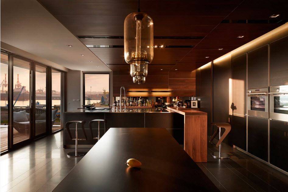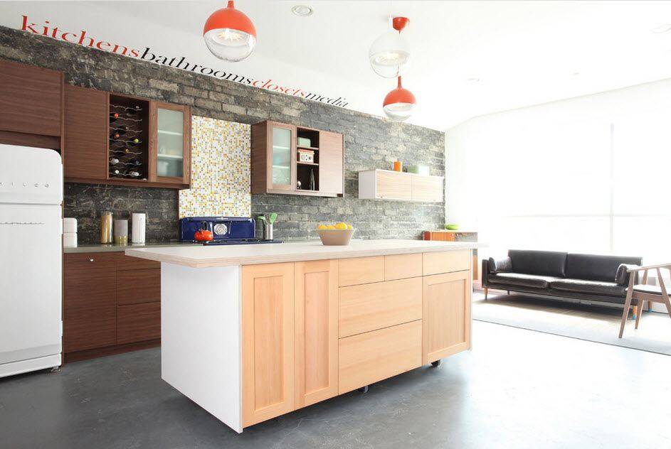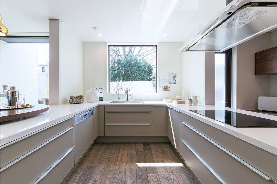 В островной или полуостровной планировке рабочая зона вместе с плитой и мойкой переносится в центр кухни. Кухни с островом выглядят круто, но во-первых подходят только для больших квартир, во-вторых подвести канализацию и воду для мойки на острове непросто. Зато это и выглядит очень дорого.