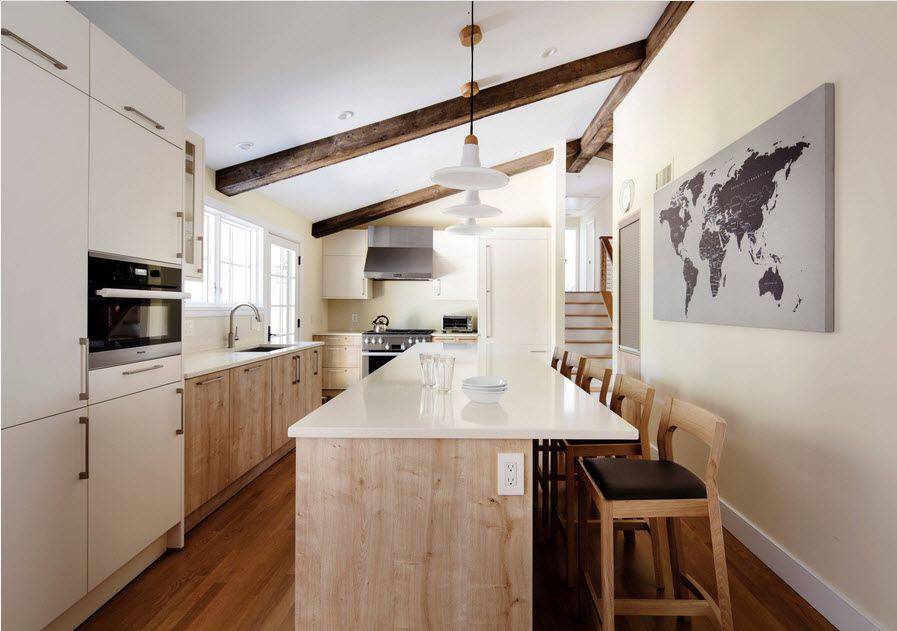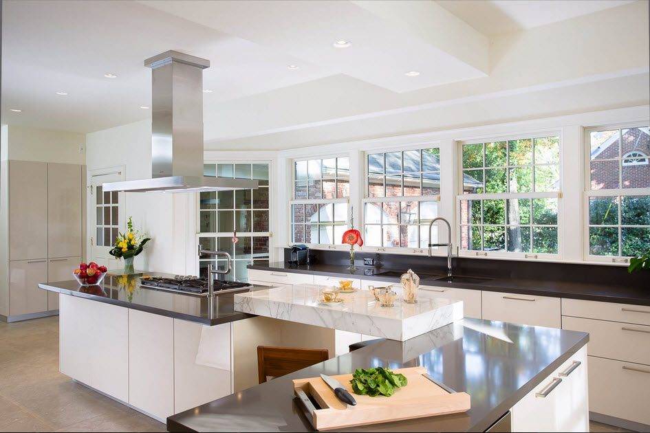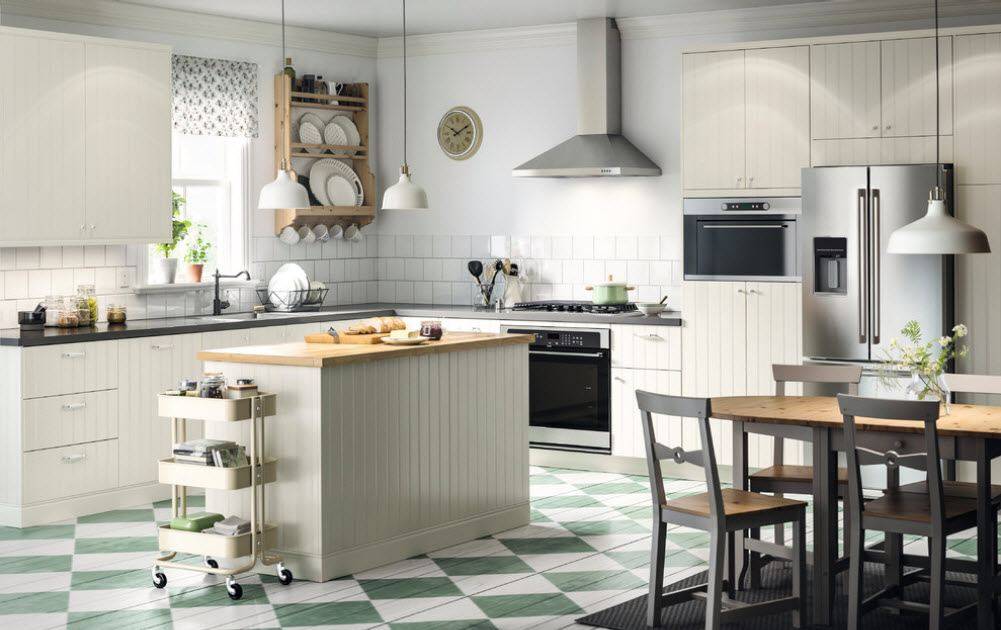 Расстановка мебели должна соответствовать циклу перемещения по кухне в процессе готовки: от холодильника к рабочему месту, дальше мойка, стол для нарезания и разделывания, и в конце цикла варочная поверхность или духовой шкаф.