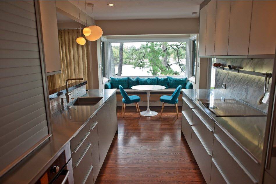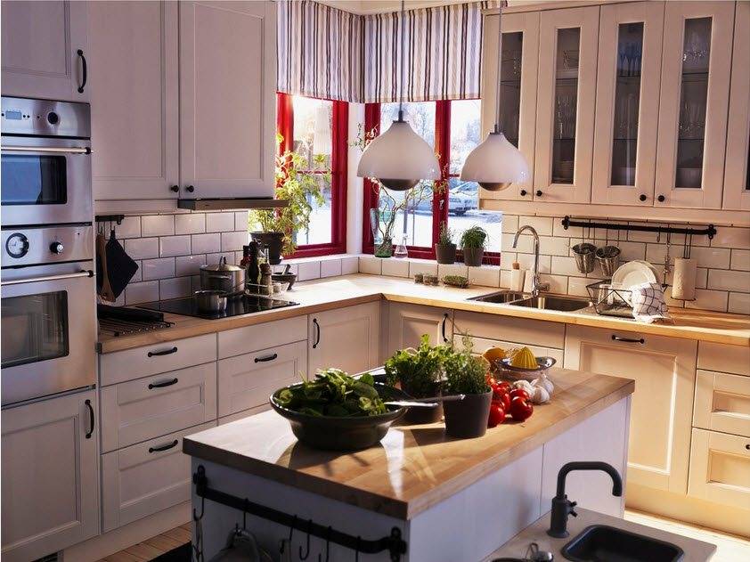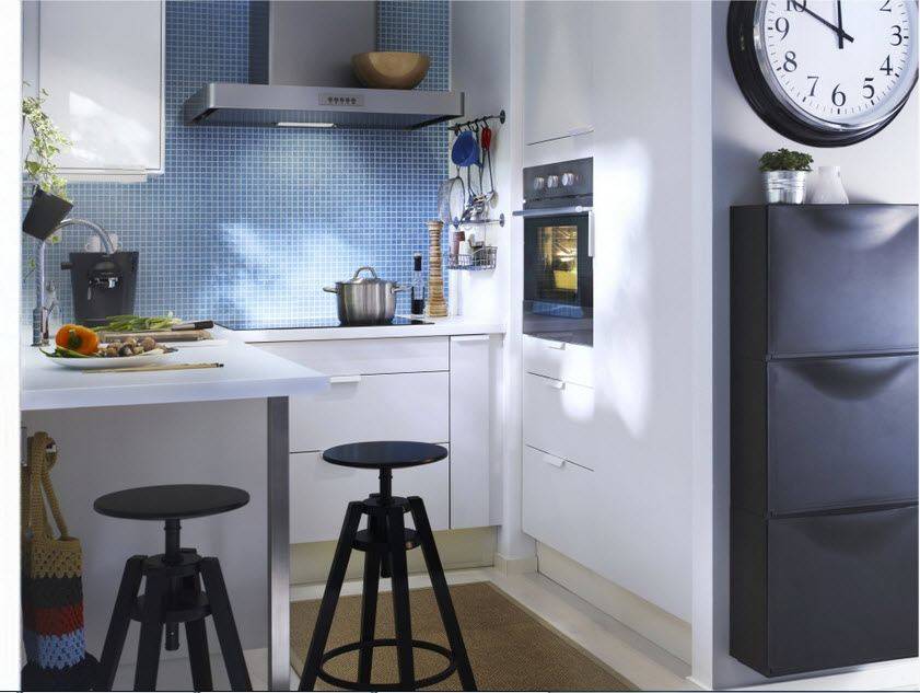 Стандартные способы расстановки мебели на кухнях до 6 кв.м. — угловая (Г-образная и П-образная), линейная и островная. Маленькие кухни и кухни близкие к квадратной форме следует делать угловыми. Линейная расстановка лучше подойдет для вытянутой и узкой (пенал) кухни. Причем можно не одну, а две стены занять мебелью, расположив мебель параллельно.