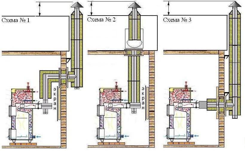 - расстояние между дымоотводными трубами и поверхностью, которая выполнена из негорючих материалов может быть не менее 5 см, а если материал поверхности горюч — не меньше 25 см.
