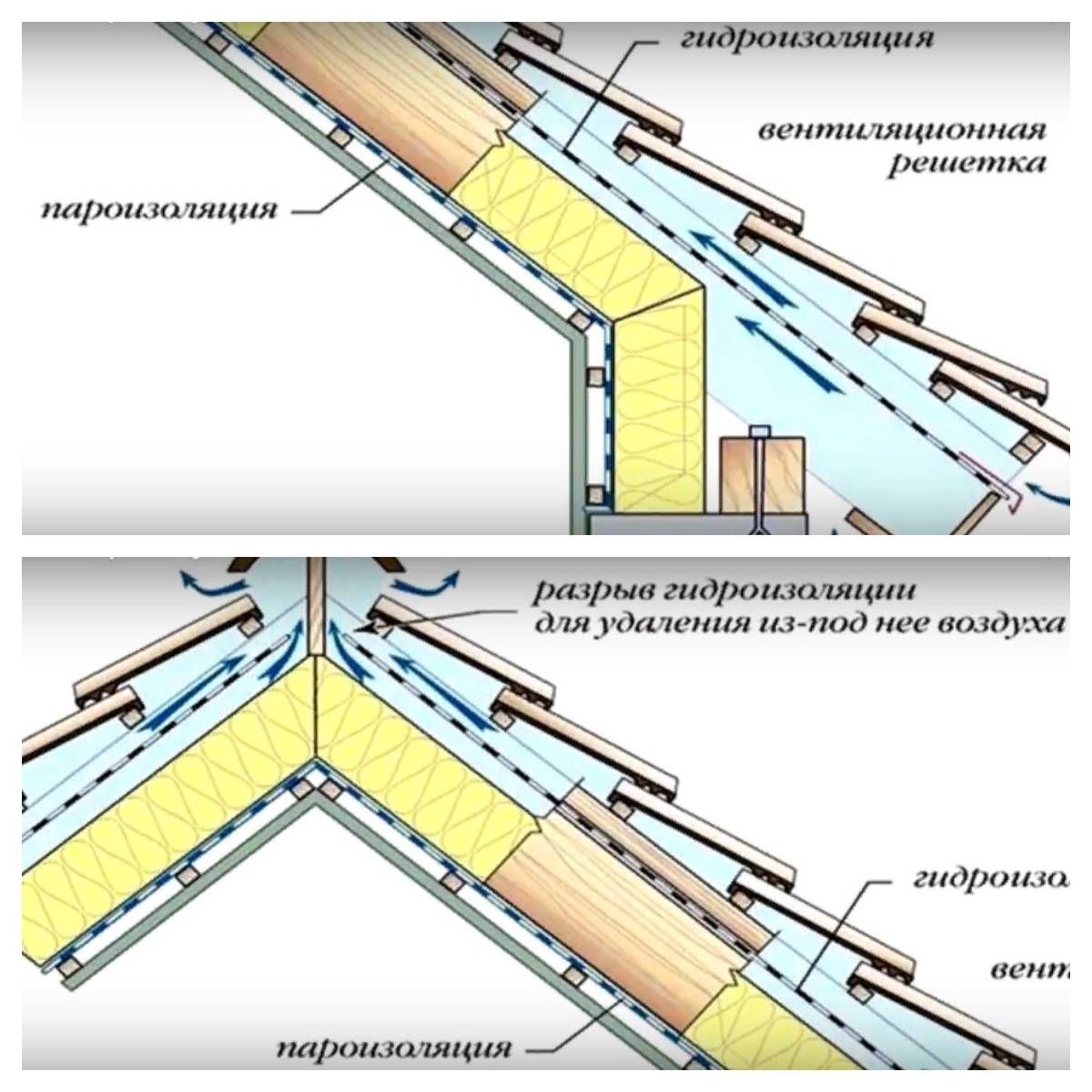 Особое устройство таких кровель не требует укладку двух слоев: теплоизоляционного и пароизоляционного. Это экономит средства и строительные ресурсы. Водяной пар, который проходит через пленку, оказывается между гидроизоляцией и профнастилом, откуда его удаляет поток воздуха.