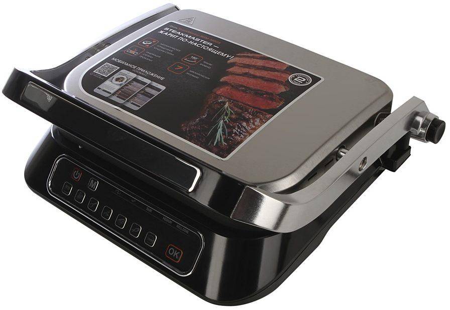 - Дополнительно: 9 автоматических программ для приготовления, сенсор для определения толщины стейка, съемные панели