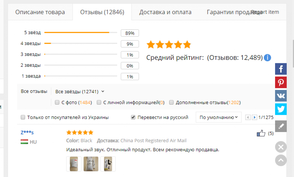 Здесь же можно найти количество оценок на «5 звёзд» (полностью удовлетворяет), на 4, 3, 2 и 1 звезду. Если большая часть оценок положительная (в примере их 89+9 = 98%), стоит поверить компании и приобрести у неё выбранный товар.