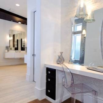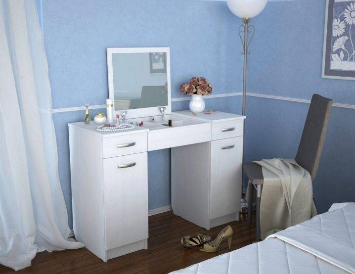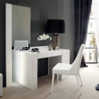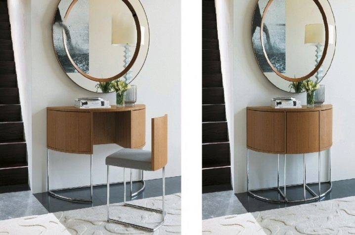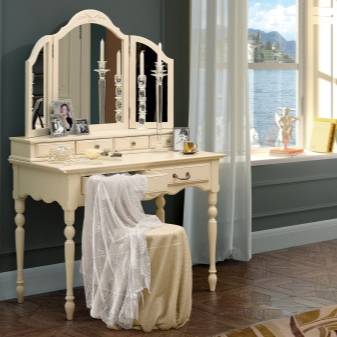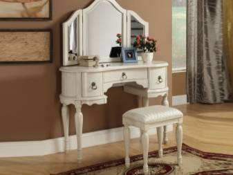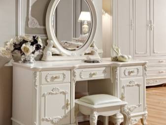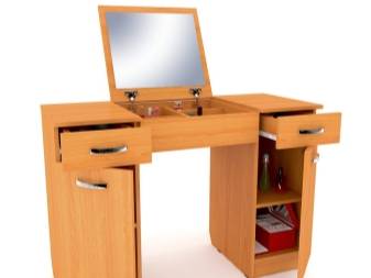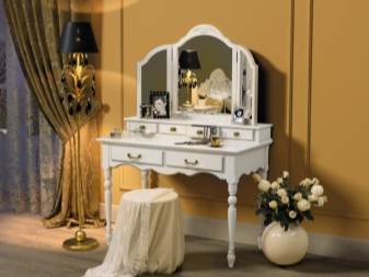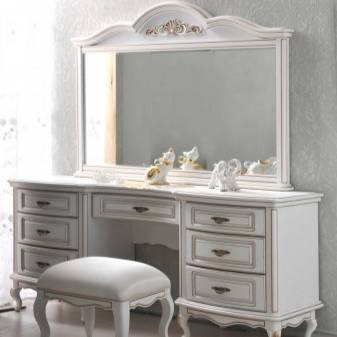 Имеет значение конструкция столика: с ящиками или без, с откидным зеркалом или стационарным, с комодом или двумя тумбами с выдвижными ящиками и так далее.