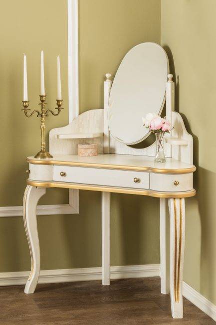 - трюмо – тоже стационарное зеркало, но больших размеров. Это то исключение, где высота столика может быть ниже 70 см. Макияж в этом случае делают стоя, столик служит лишь местом хранения;