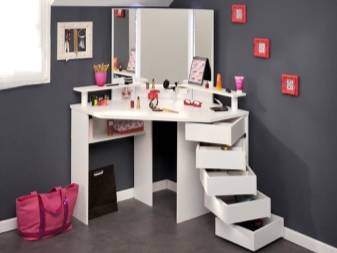 Если в спальне недостаточно места для установки большой модели с широкой столешницей, на которой можно разложить все самое необходимое, то стоит купить угловую. Такое решение сделает комнату более эргономичной и функциональной одновременно. Ведь пространство в таком случае используется намного эффективнее.