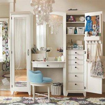 - В шкафу. Производители мебельных гарнитуров, а именно спален, в последнее время вводят туалетные столики в их состав. Например, вместо простого шифоньера в спальне будет стоять шкаф со встроенным внутрь туалетным столиком. Удобство налицо, ведь зеркало здесь бывает большое, даже ростовое, и заодно к макияжу подбирается одежда.