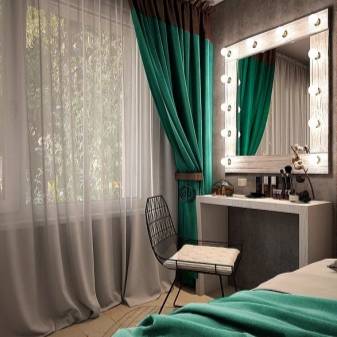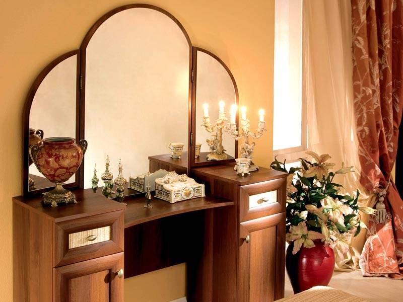 Если маленький или средних размеров туалетный столик допускает использование небольшого настольного зеркала, то крупный предмет следует оборудовать большим зеркалом. Трельяж, трюмо или настенное зеркало большого размера будет смотреться гармонично.