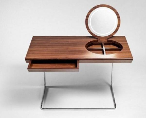 - Туалетный и письменный. Минималистичный дамский раскладной столик-трансформер может выполнить функцию рабочего стола для компьютера или ноутбука, а также места для письма. Если же надо прихорошиться, поверхность поднимается, и с внутренней стороны крышки стола находится зеркало, а также маленькие ящички для мелких вещей.