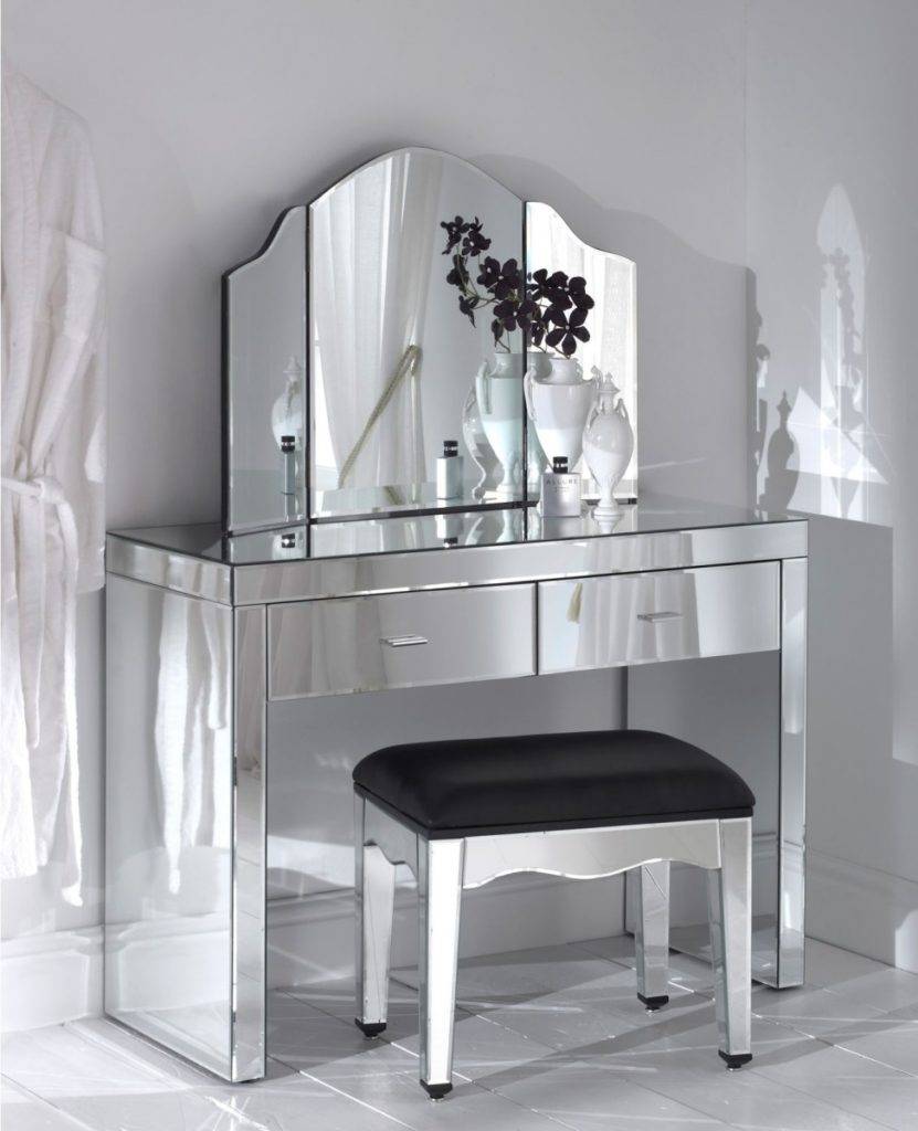 На современном мебельном рынке можно выбрать изделие не только определенной цветовой гаммы, но и определенного оттенка. Ввиду разнообразия материалов для изготовления будуарных столиков, существует широкий ассортимент изделий, сочетающих в себе разные цвета. А это очень выгодно при сочетании с интерьером. Например, серебряный металлический корпус зеркала, такие же ножки и черный столик – беспроигрышный вариант в сдержанном модерне.