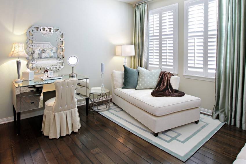 Желательно выбирать абажуры с матовой текстурой и единым сплошным цветом. Стол с зеркалом и подсветкой даст возможность максимально комфортно проводить за ним время, даже в комнате с маленькими окнами.