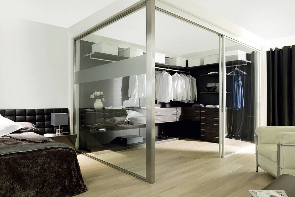 - Стекло. Помогает сделать комнату просторнее, обеспечивает доступ света внутрь гардеробной.