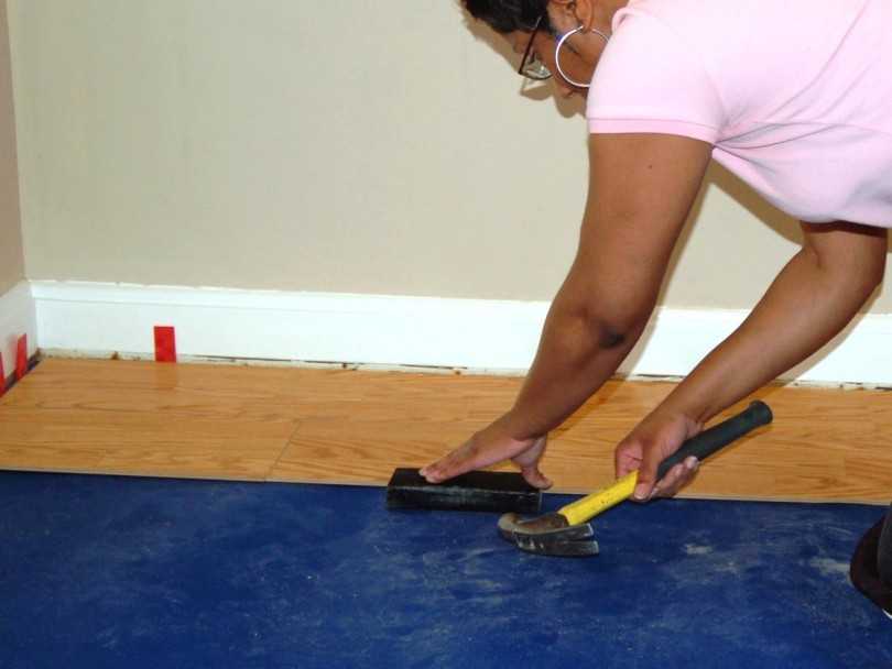 Начинайте укладывать ламинат всегда от стены, при этом необходимо простукивать плитки, таким образом уберется зазор между ними.