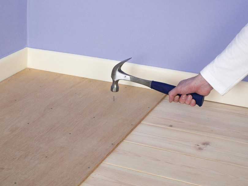 - Деревянный пол нужно тщательно зафиксировать, чтобы он не скрипел и не прогибался. Выровнять его можно листовыми материалами: фанерой, ОСБ.