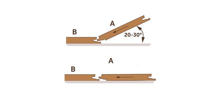 - Для стыковки панелей их нужно вставить под углом 45 градусов и опустить, либо подбить молотком через специальную прокладку (в зависимости от типа замков).