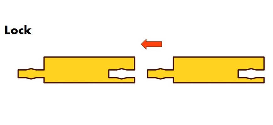 - Lock-замки. Данный вид выступает в роли защелок, которые позволяют каждый последующий элемент ламината, всовывать в паз предыдущей панели. Такой процесс выполняется строго по вертикали или горизонтали. После соединения частей, специалисты рекомендуют подбивать части друг к другу, молотком из резины или предварительно промазать замки клеем. Воспользовавшись подобной рекомендацией, повышается надежность и качество соединения.