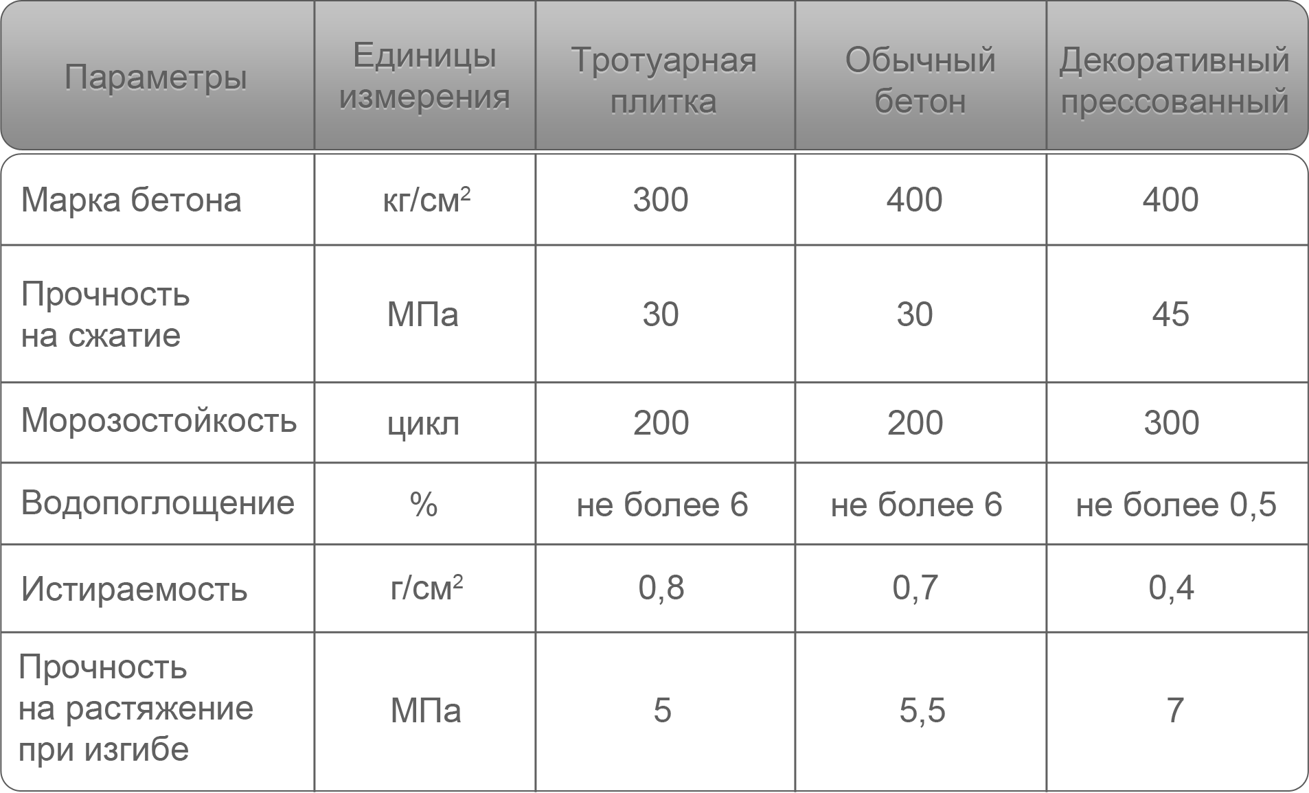 | Монтаж плит/плиток из натурального камня | Достаточно высокие, в зависимости от сорта и качества камня, размеров плит | Средний/низкий, в зависимости от технологии укладки | Длительное при правильной укладке и средней интенсивности эксплуатации | Зависит от размеров и формы плит, технологии и качества укладки | Ограничено использование транспорта (кроме профессионально уложенной брусчатки) |