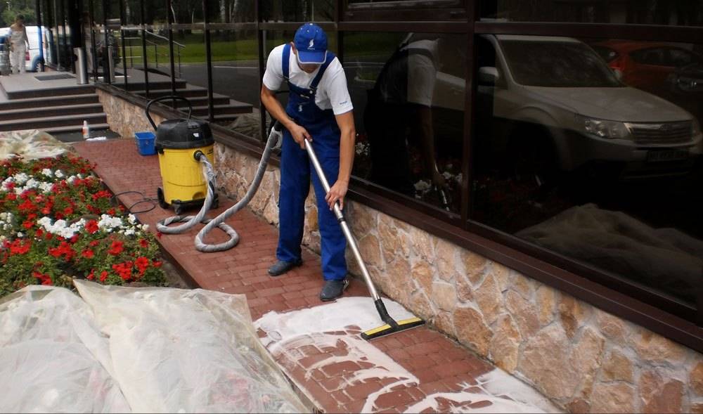 Между брусчаткой швы засыпают сухой ЦПС и проливают водой. Операцию повторяют до тех пор, пока смесь не перестанет усаживаться. Через 2–3 суток, когда поверхность окончательно высохнет, убирают строительный мусор, веником сметают мелкий сор и пыль и, при необходимости, промывают поверхность сильным напором воды из шланга.