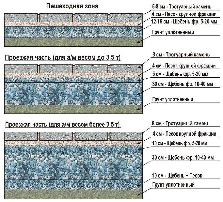 Согласно нормативным требованиям (ГОСТ 17608-91, СНиПы Ш-8-76 и Ш-10-75), в зависимости от предполагаемой нагрузки на площадку или проезжую часть (стоянку для транспорта) толщины слоев и фракции песка и каменной крошки различается.