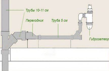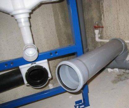 Возможны варианты, когда приходится комбинировать трубы различного диаметра. Например, к отводу от раковины (50 мм) присоединяется труба унитаза. Очевидно, что требуется переходник на трубу 110 мм (+)