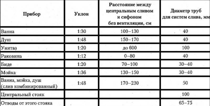 В таблице приведены данные не только максимальных уклонов соединительных участков для каждого прибора домашней сантехники, но и примерные расстояния до общей сливной трубы.