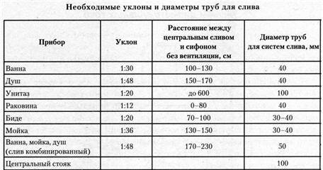 Уклон отводных труб от разных сантехнических приборов
