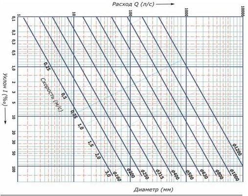 Данный график подскажет, как рассчитать уклон канализации, обеспечивающий при данном диаметре труб необходимый расход воды.