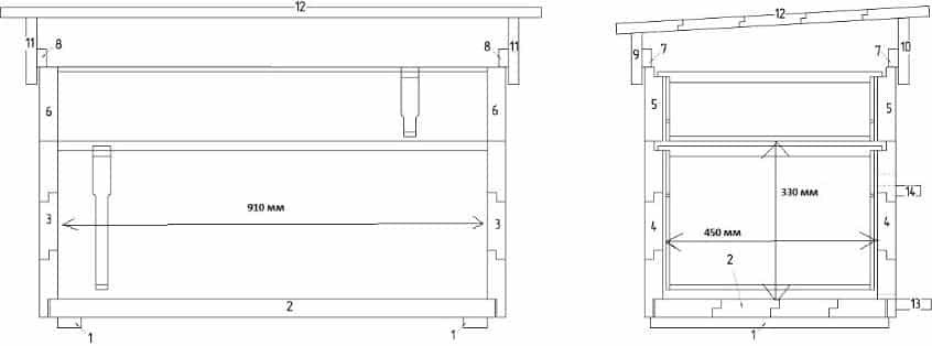 Для изготовления улья лежака на 24 рамки своими руками можно воспользоваться чертежом ниже. Улей имеет форму продолговатого ящика. На схеме обозначена каждая деталь. 1- ножки улья 2- дно 3- боковые стенки 4- передняя и задняя стенки 5 и 6 стенки магазина 7 и 8 — плинтуса, набиваемые изнутри крыши для ограничения установки её на корпус улья 9 10 и 11 – вертикальные стенки крыши 12 – горизонтальная часть крыши.