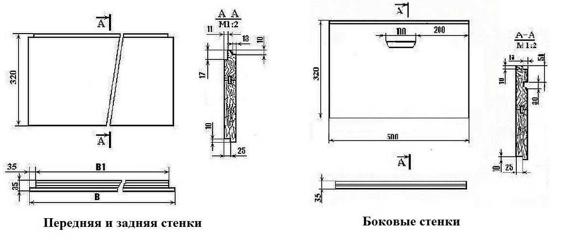 Из доски 35 мм нарезают заготовки согласно чертежу. Подготавливают места соединения, выбираются фальцы. Заготовки шлифуются. Широкие доски при сборке противопоставляют узким (если передняя нижняя доска широкая, боковые нижние берутся узкие). Места соединения проклеивают. Используется ПВА или столярный (казеиновый) клей