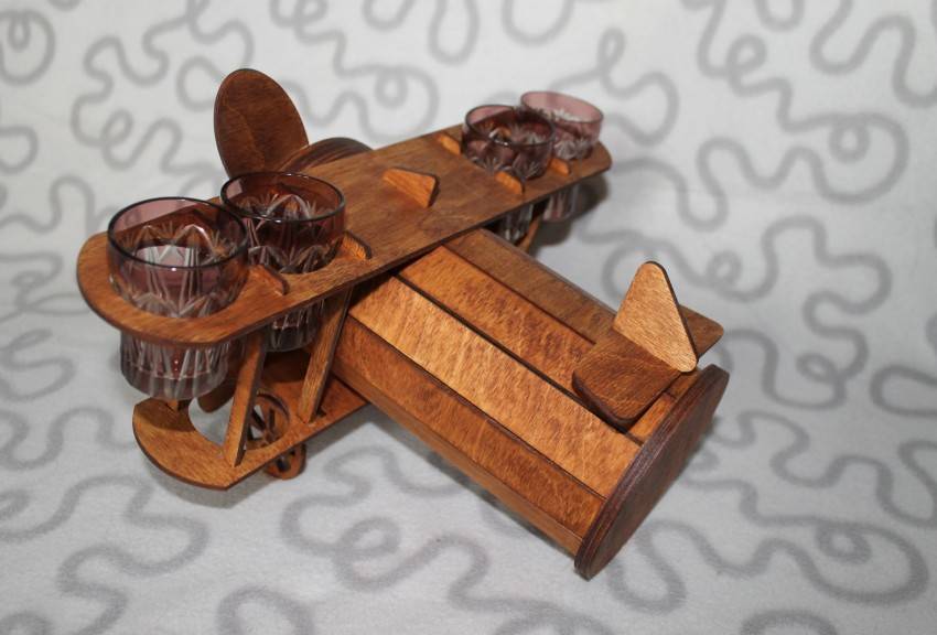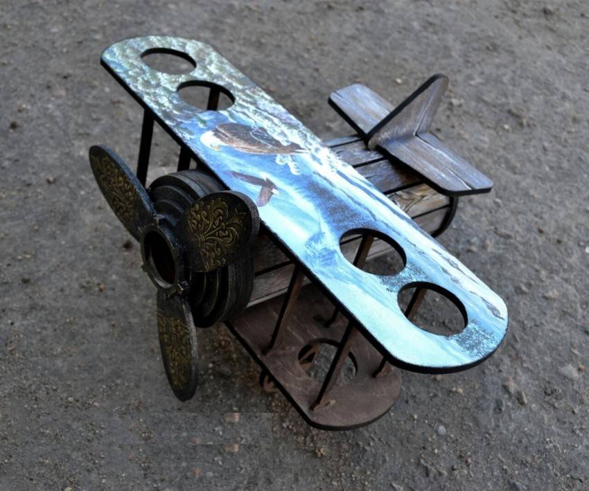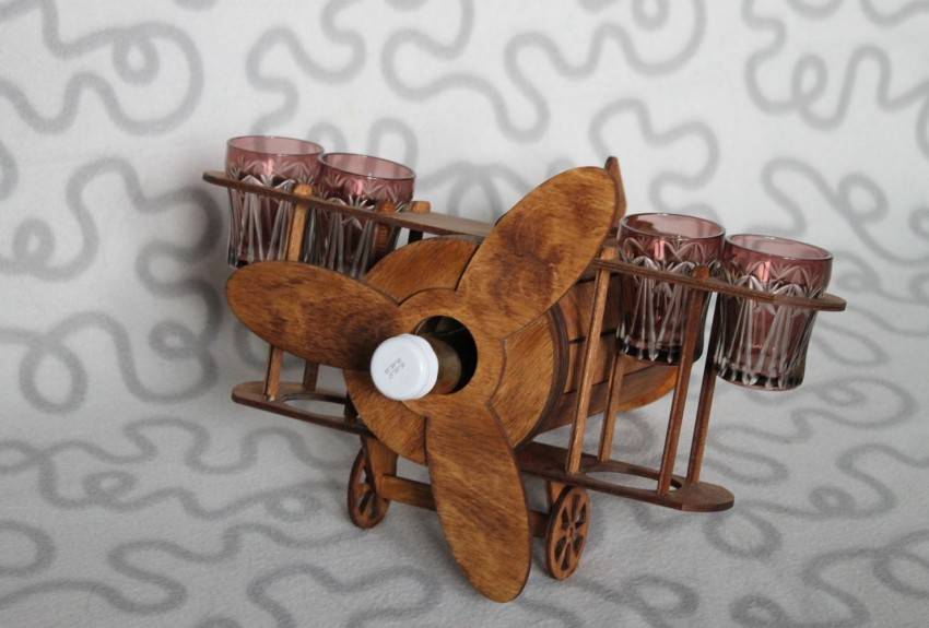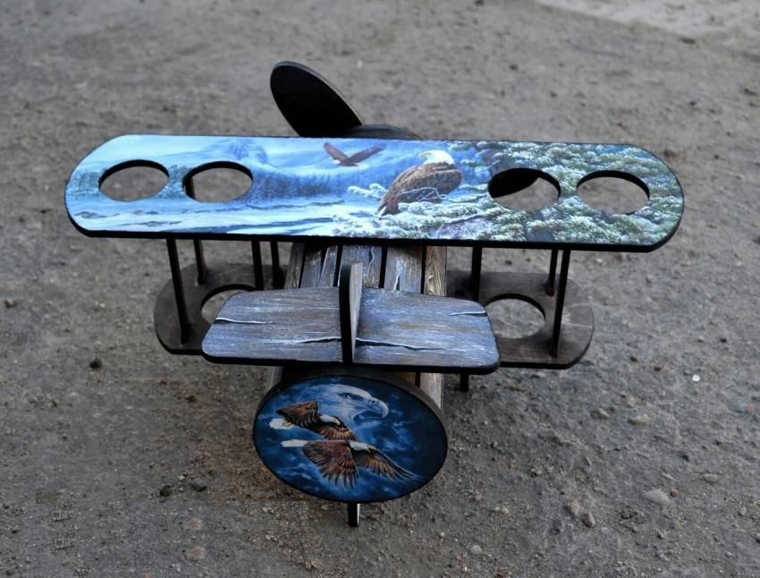 - Замерьте диаметр среза и вырежьте точно такой же круг из фанеры, в нём выполните вырезы для бутылок. Их можно сделать разной формы.