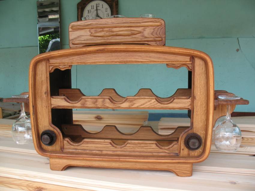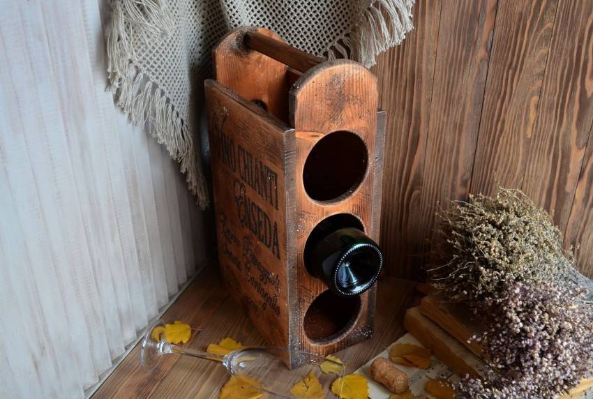 ![]() | На узких брусках делаем отверстия под донышко и горлышко винных бутылок. Затем окрашиваем эти детали |