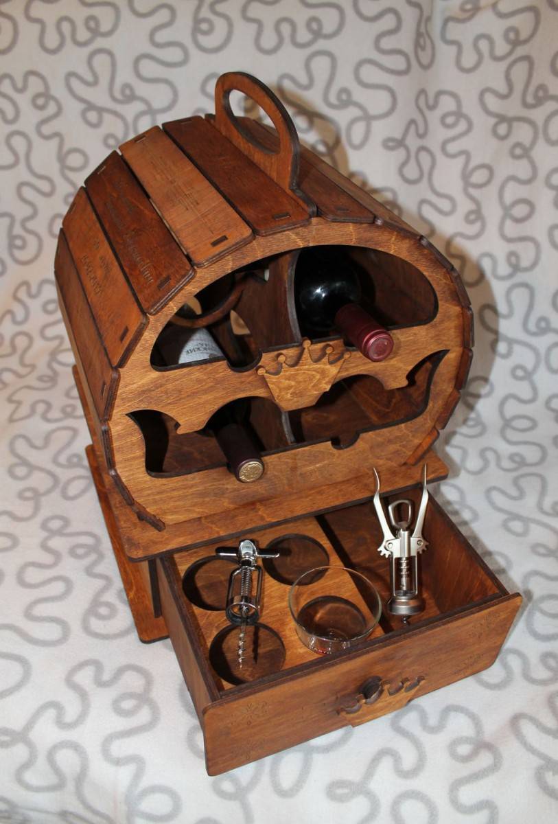 Чтобы сделать шкаф для алкоголя, необходимо правильно подобрать материал. Для сборки может понадобиться обработанное дерево, например, ясень, дуб, вишня, орех и карельская берёза. Друг или начальник обрадуется такому подарку, поскольку шкаф из натурального материала отличается долговечностью и стильным дизайном. Сделать бар в гостиной можно даже из старых досок, если пройтись по ним наждачкой и лаком.