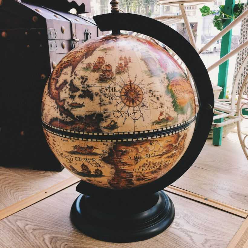 Самым простым вариантом станет установка глобуса на три или четыре ножки и обработка поверхностей лаком, имитирующим творения старины глубокой.