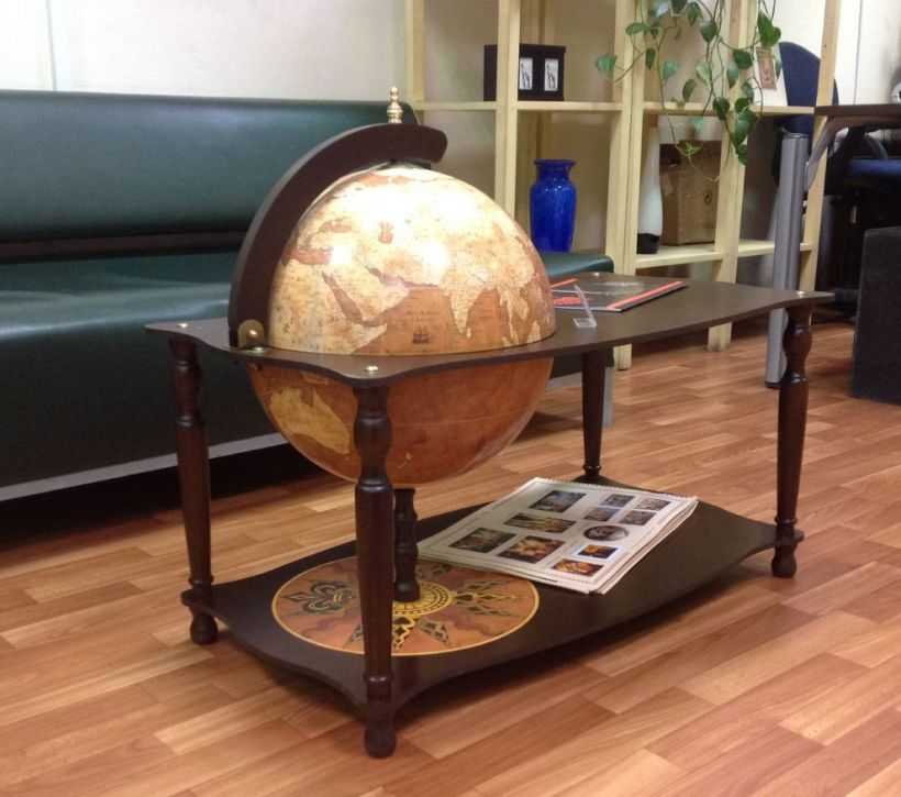 Остаётся только прикрепить глобус к любому деревянному каркасу. Для этого может использоваться и обычный журнальный столик. Также можно создать индивидуальный вариант напольной подставки с дополнительными ярусами из деревянных балок и соорудить барную стойку мини. Их в дальнейшем можно покрыть лаком или покрасить. Собирается такой каркас с помощью шуруповёрта и саморезов или маленьких гвоздиков.