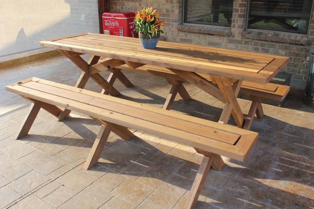 Такую мебель обычно размещают на лужайке в саду либо на открытой террасе. Для такого столика не нужны стулья или скамейки. Места для сидения уже предусмотрены его конструкцией. Мебель получается широкой и громоздкой. Поэтому для нее сложно найти удачное место для зимнего хранения. Скамейки закрепляют прямо на ножках столика. Сами лавочки и поперечины для их крепления стягивают опоры со всех сторон.