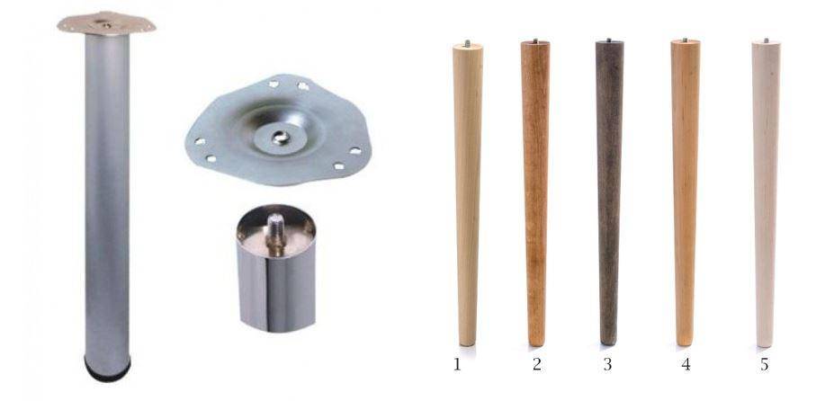 Готовые мебельные ножки изготавливаются из дерева и/или металла, могут быть одиночными или в виде плоских/фигурных опор, гладкими или с декором.