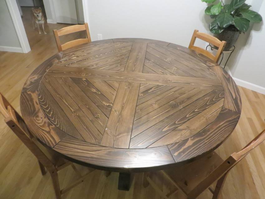 Подобная методика позволяет получить столешницу любой формы, достаточно отрезать доски по предварительно начерченной линии.