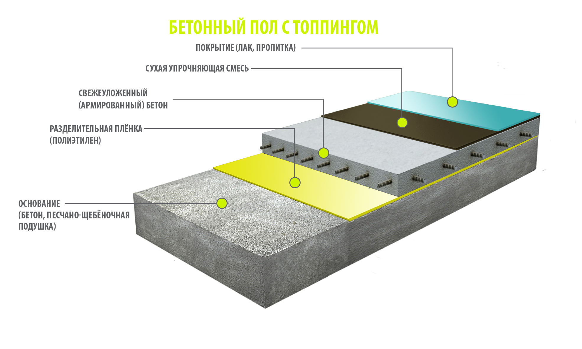 Современная технология укрепления основания с использованием топпинга подразумевает использование специальной сухой смеси, в состав которой входит портландцемент (марка: высшая), пигмент, полимерные добавки, полипропиленовая фибра, а также износостойкий наполнитель. Поэтому, прежде чем приступить к практическому закреплению пола, следует определить критерии приложенных будущих испытаний над поверхностью и, соответственно, тип используемых допантов (упрочнителей):