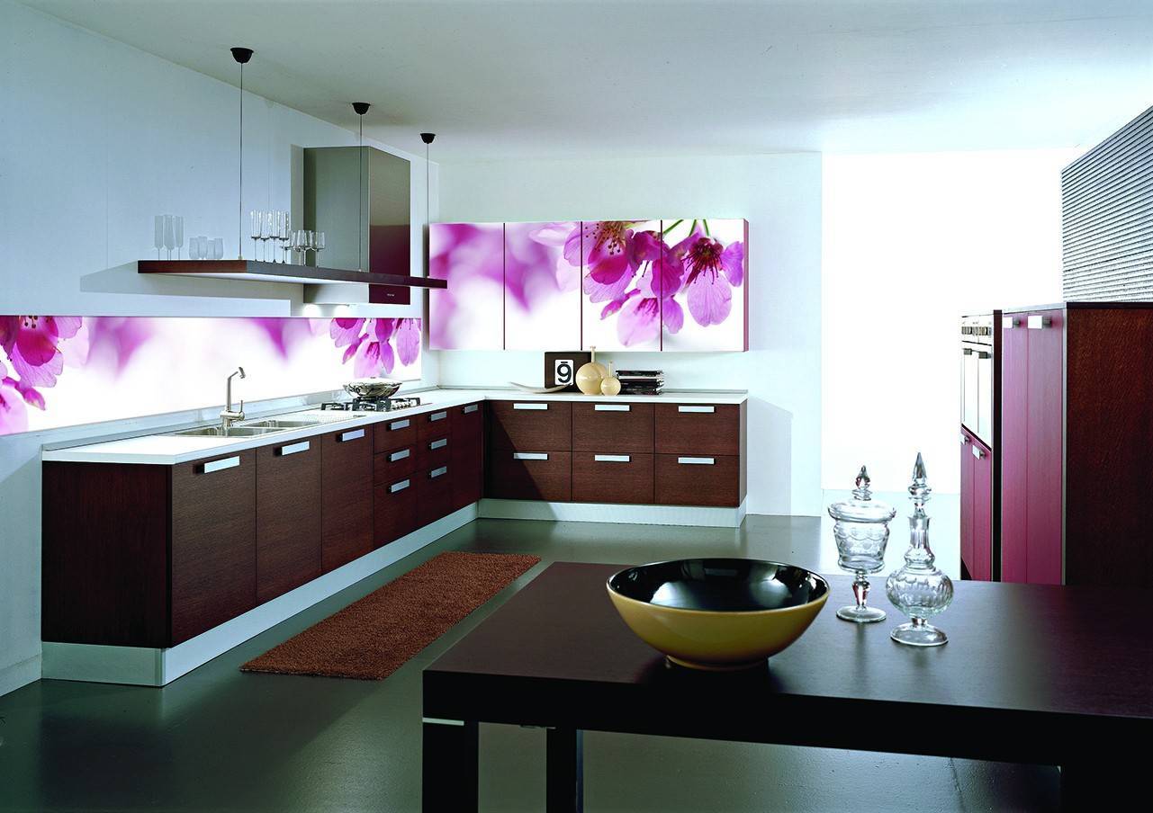 На сегодняшний день очень популярны кухонные фартуки с фотопечатью, которая наносится на акриловую основу точечным способом. Сверху рисунок в несколько слоёв по особой технологии покрывают лаком. Он создаёт эффект стекла, придаёт высокий глянец и защищает изображение от повреждений.