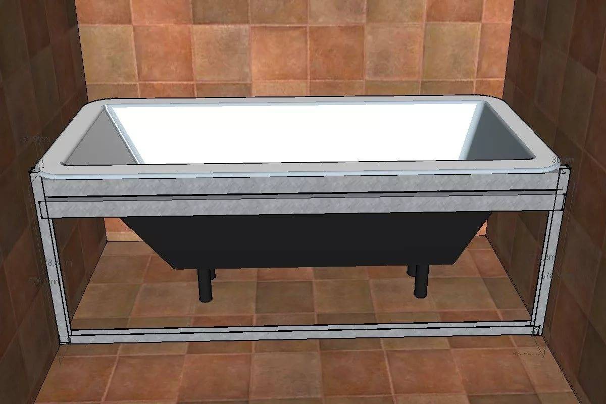 - Готовый каркас устанавливают по центру днища ванны, а затем прикрепляют к нему ножки. На центральной части рамы под дном емкости фиксируют 2 опоры, вдоль фронтального края 3, а вдоль стены еще 2 опоры.