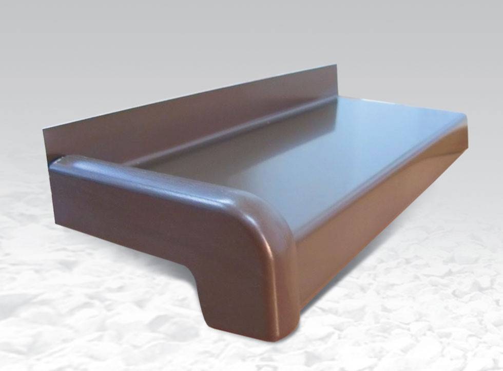 Это отливы, изготовленные из алюминия или его сплавов. Для производства используется листовой прокат толщиной 1–2 мм. В зависимости от изготовителя, такие оконные отливы могут иметь однотонное полимерное покрытие или покрытие, имитирующее натуральные материалы (камень, дерево). Еще для декорирования и защиты водоотливного профиля от атмосферных воздействий применяется анодирование поверхности.