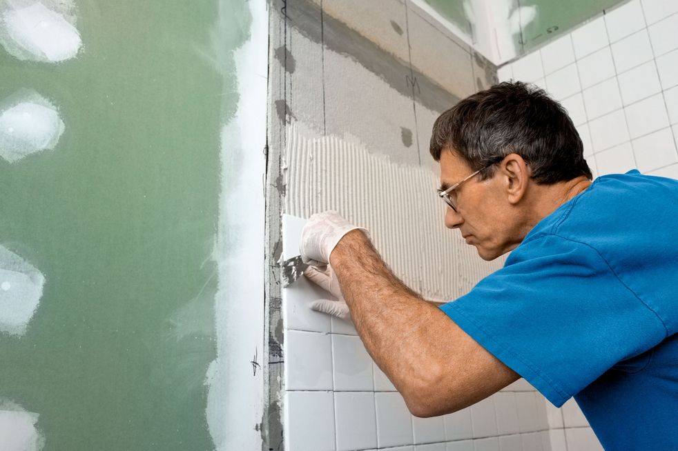 Приклеивание маленькой плитки в ванной комнате на гипсокартонные стены