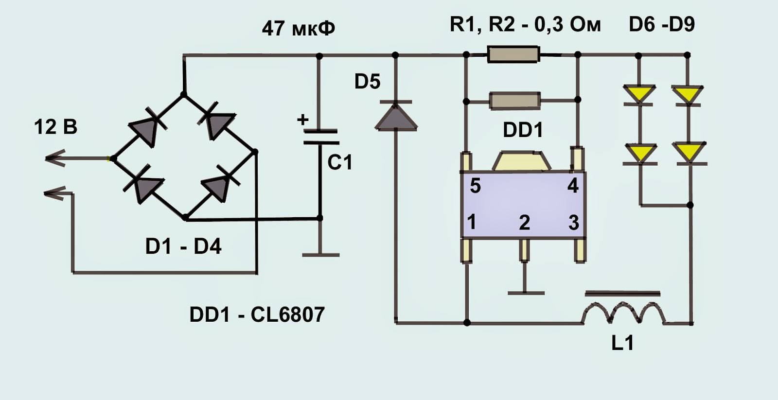 Входная часть схемы является местом для установки гасящего резистора и емкости. Эти элементы используются системой в качестве понижающего блока питания. За ними располагается диодный мост, предназначенный для трансформации переменное напряжение в постоянное, которое требуется светодиодам.
