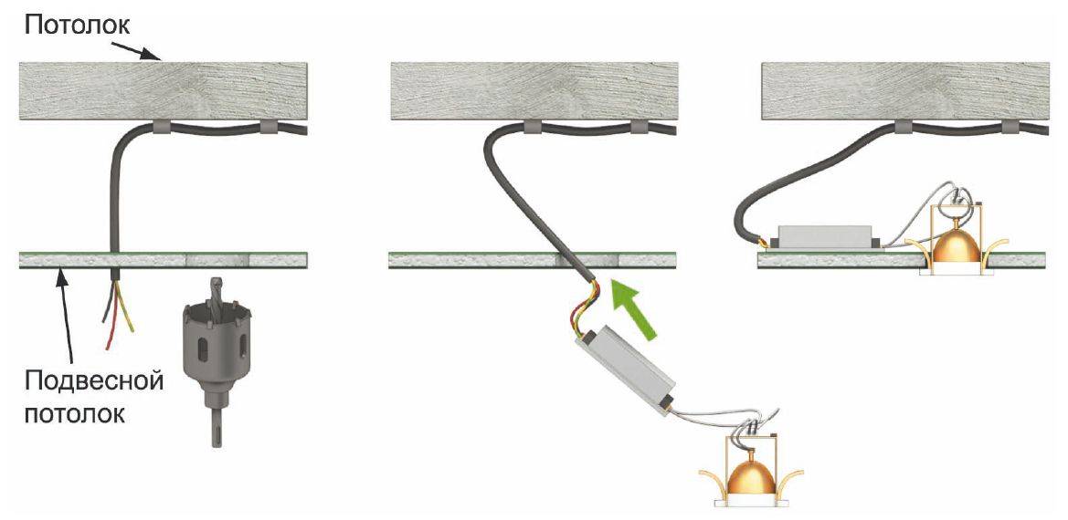 Как и при установке других типов потолочных покрытий, перед началом их монтажа следует позаботиться о проводке для светильников. Она должна располагаться под потолочным покрытием и проходить в тех местах, где планируется разместить точечные светильники.