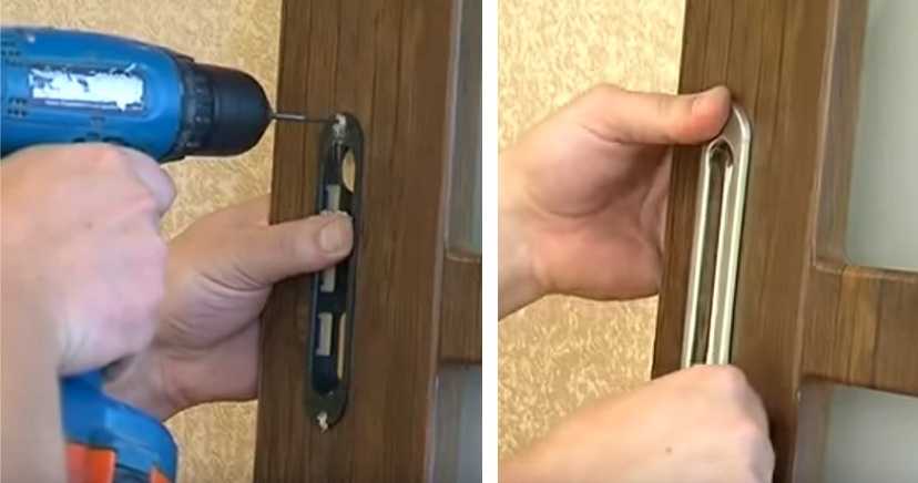 Чтобы установить раздвижные двери с врезным замком, необходимо дрелью сделать углубление в торце полотна. В паз монтируют запорный механизм и закрывают специальной планкой. Ручка в данном случае используется не врезная, а скоба. В проеме делают углубление для ответной планки. Если замок навесной, его прикручивают саморезами к полотну двери.