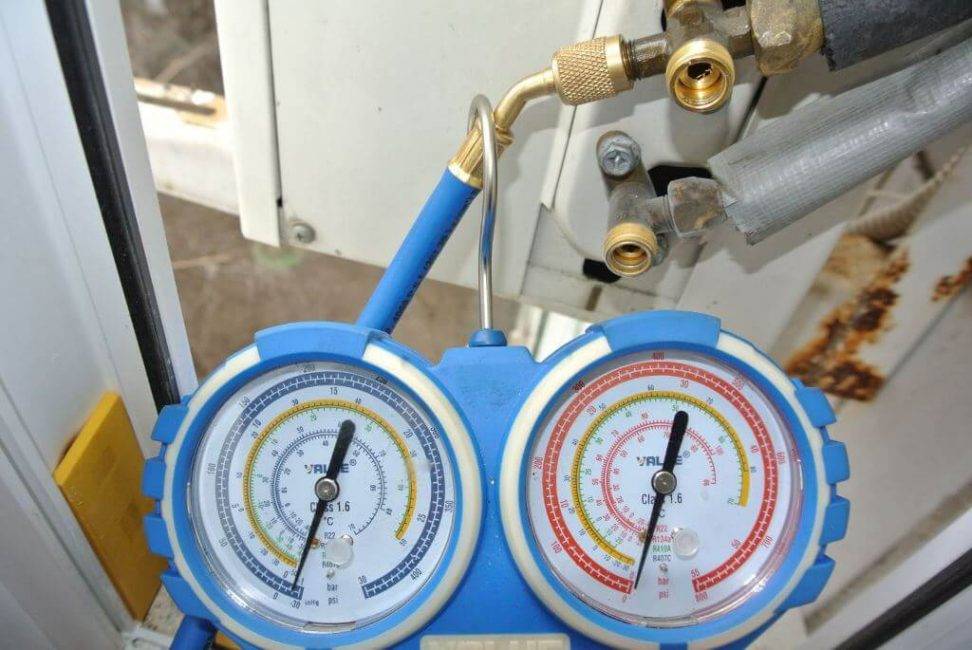 Потом насос отключают, закрывают вентиль насоса но не отсоединяют и оставляют еще минут на 15-20. Все это время надо наблюдать за показаниями манометров. Если система герметична, изменения давления нет, стрелки манометров замерли на месте. Если стрелки меняют свое положение — где-то есть утечка и ее необходимо устранить. Найти ее можно с помощью мыльной пены и подтянуть соединение (обычно проблема находится в месте подсоединения медных трубок к выходам блоков).