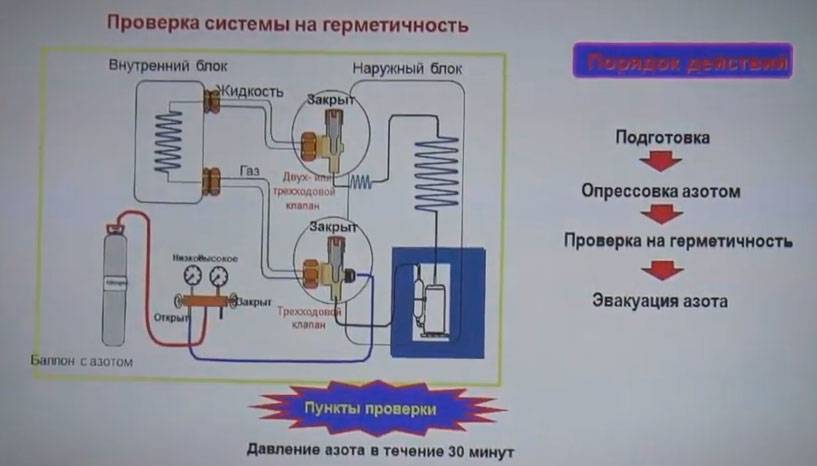 Если есть подозрение на утечку из-за негерметичности соединений или компонентов системы, следует удалить из системы хладагент, закачать ее азотом, провести поиск проблемных мест, устранить неполадки, выполнить опрессовку и вакуумирование системы.