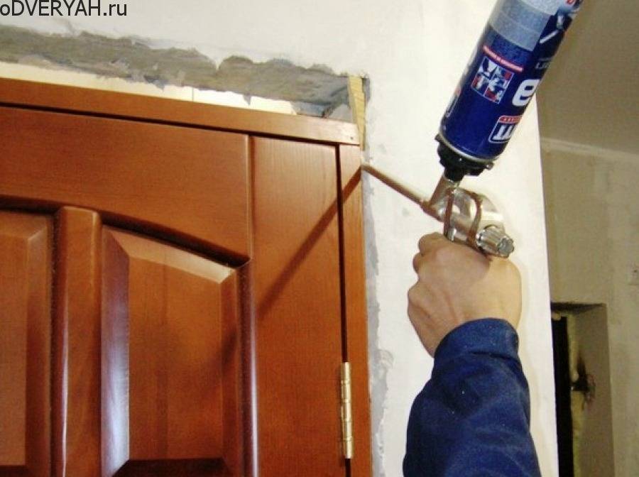 Зазоры могут появляться как между полотном и дверной коробкой, так и между самим дверным блоком и конструкцией дома (стены, потолок, пол). Первые задувают пеной. Но, для того чтобы застывающая пена не создала ям и просветов ввиду давления и ниспадания к низу, желательно первоначально поместить в щели картон. Герметик лучше прилипает к мокрой поверхности, поэтому проем следует слегка смочить водой. Задувают зазоры при закрытом положении. Желательно не трогать деревянную конструкцию 10-12 часов. Остатки пены аккуратно срезаются строительным ножом под линейку или шпатель.
