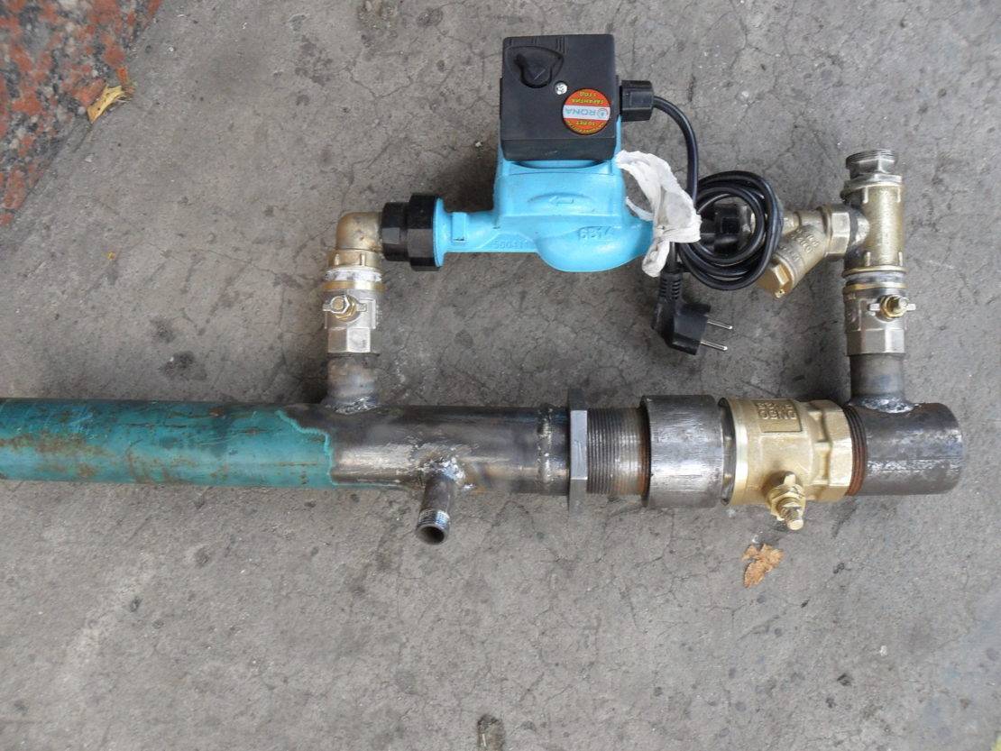 Он формируется в виде прямого участка трубы, который врезается в линию подачи или обратки. К нему с помощью тройников и отводов подключается насос с обвязкой из двух вентилей и фильтра грубой очистки.