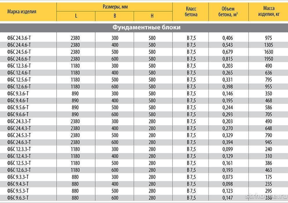 Сортамент самых популярных блоков ФБС представлен в таблице: